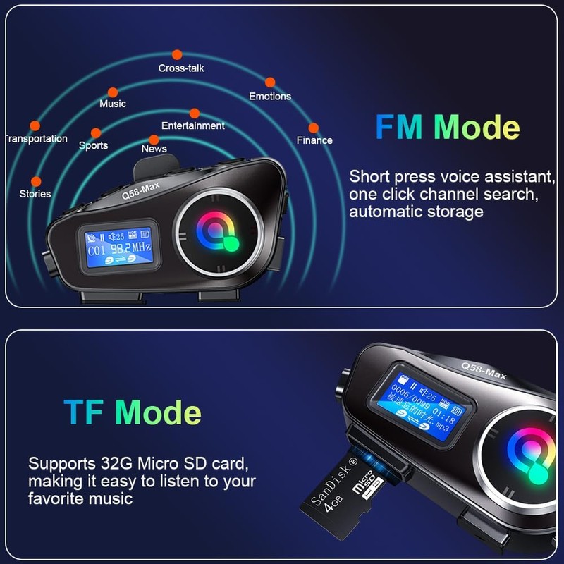 - Multifunctional motorcycle headset: the Bluetooth helmet headset not only supports FM radio, but also a 32G TF card, and with the share music function, you can enjoy songs stored on your smartphone with another driver or passenger. You can operate your smartphone directly via voice commands. Turn on the torch or RGB ambient light on the headset at night to make motorcycling even more fun!