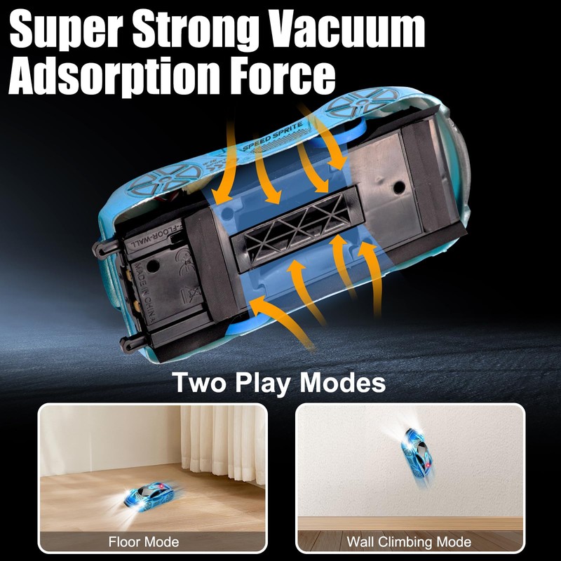 - Secret of wall climbing: The wall climbing car has three speed switches: (OFF) to turn off the wall climbing function, (FLOOR) for ground driving mode and (WALL) for wall climbing or ceiling mode. Please choose according to your needs. In addition, the paper on the bottom edge of the car improves its climbing grip. Please make sure it stays intact and does not tear.