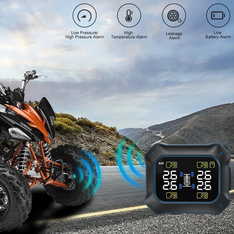 - 【Four-wheel Tire Pressure Monitoring】Real-time monitoring of tire pressure and temperature, equipped with LCD display and four-wheel display. It can read data from any angle, improve tire life and prevent tire inflation. Suitable for off-road vehicles, ATV, four-wheel off-road motorcycles