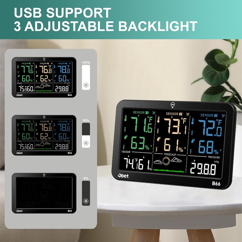 OBET Weather Station Wireless Indoor Outdoor Thermometer with 3 Sensors, Temperature Humidity Monitor with Alerts 500ft Range and 3 Adjustable Brightness