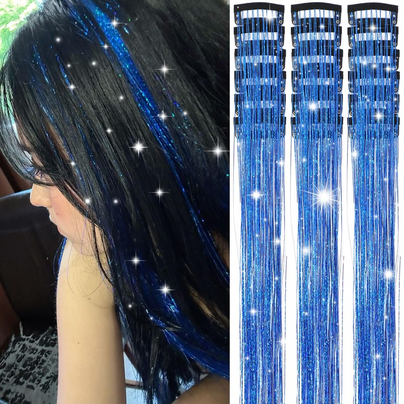 Obinying Hair Tinsel 18 Pcs Hair Tinsel Clip in 20.5 Inch Glitter Tinsel Hair Extensions Fairy Hair Tinsel Kit Clip in Hair Tinsel Party Festival Hair Accessories for Girls Women Kids (Sapphire blue)