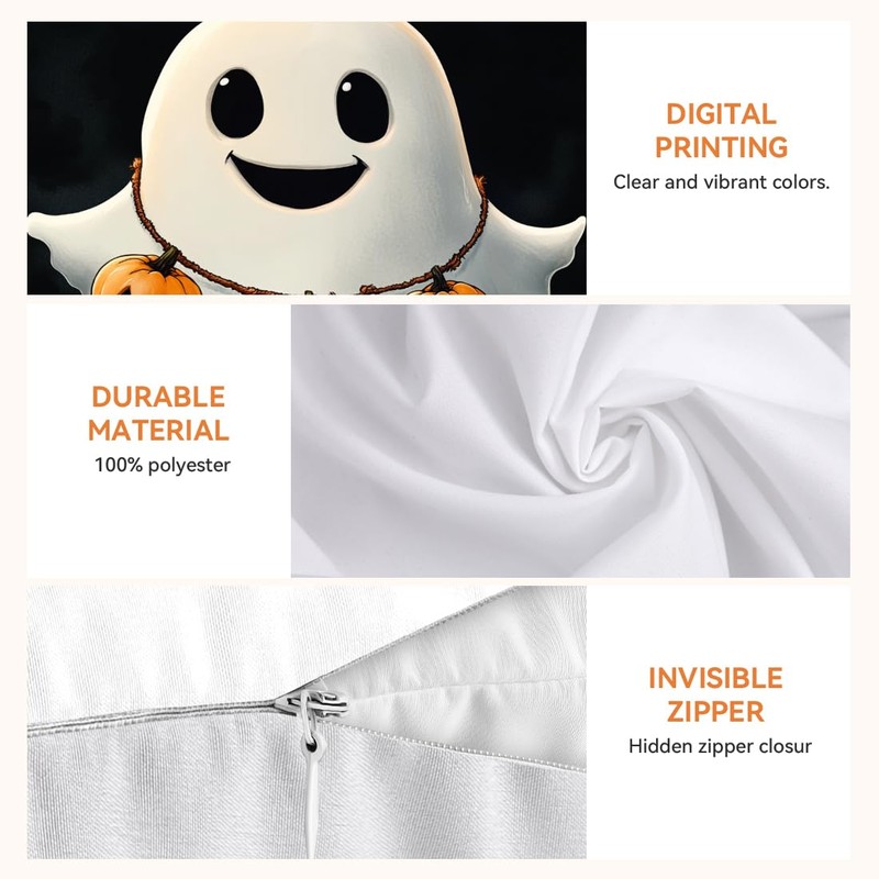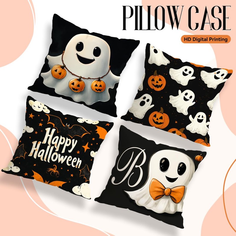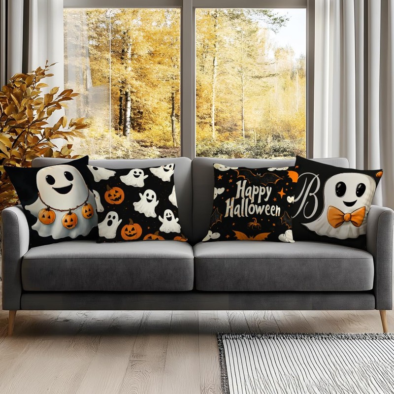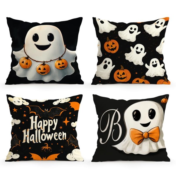 OBSEDE Fall Pillow Covers 18x18 Set of 4, Gentleman Ghost and Pumpkin Harvest Cushion Cases Inserts for Sofa Couch Bed Home Decor Thanksgiving Farmhouse Decorations, Single-Sided Print