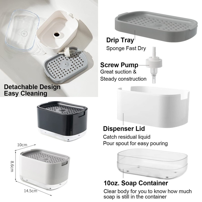 • Detachable hand soap dispenser for bathroom with screw pump for great suction power; clear crystal plastic caddy for dispensing soap; water holder lid catch residual liquid; drip tray keeps sponge dry fast