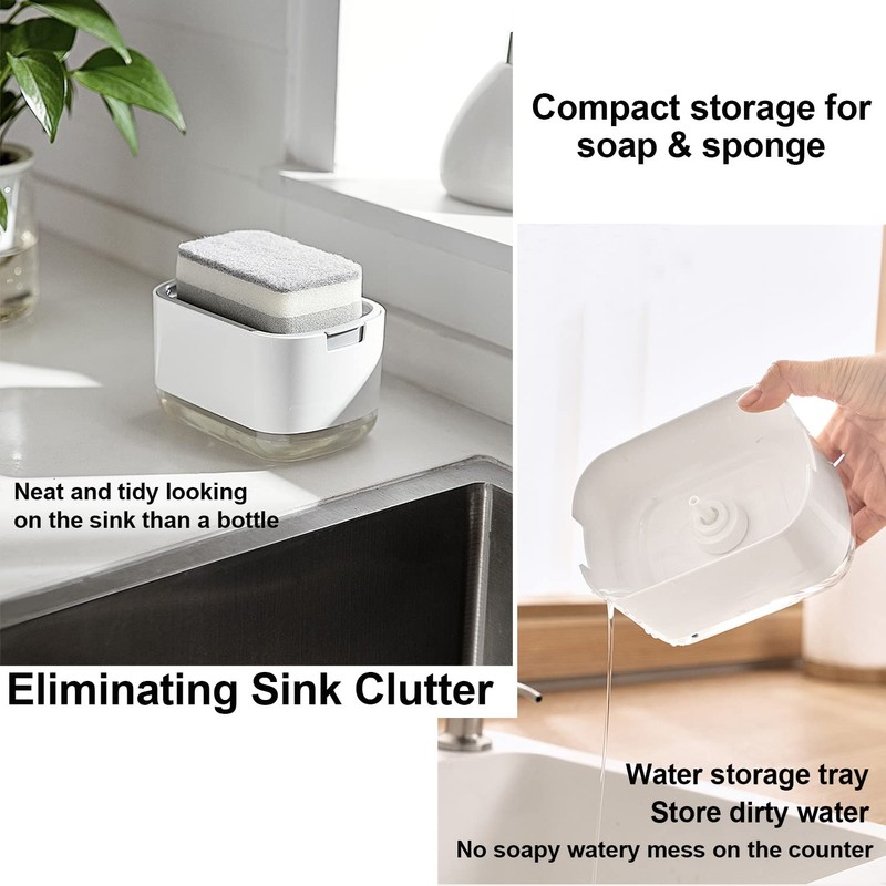 Slick little countertop soap dispensers makes clean up after cooking a breeze. A multifunctional dish soap container 2-in-1 to replace a bottle of soap and a sponge / sponge dish.