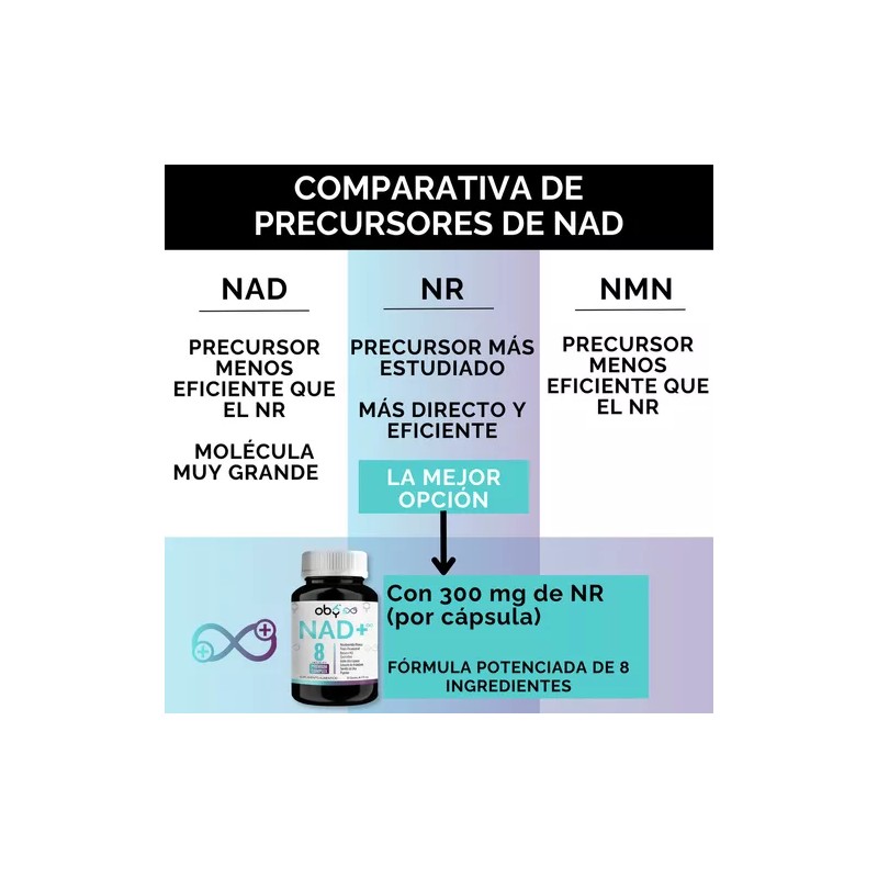 Quienes buscan mayor energía, mejorar el metabolismo celular y protección antioxidante para combatir el envejecimiento, respaldados por ciencia avanzada; OBY NAD+ Trans Resveratrol Infinity es para ti: el único en su categoría con 8 ingredientes premium. ¡Sí, ocho! Nadie más ofrece esta fórmula superior tan completa.