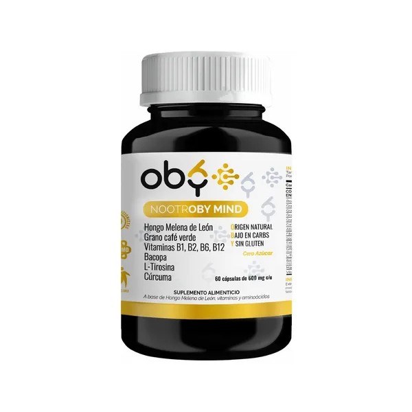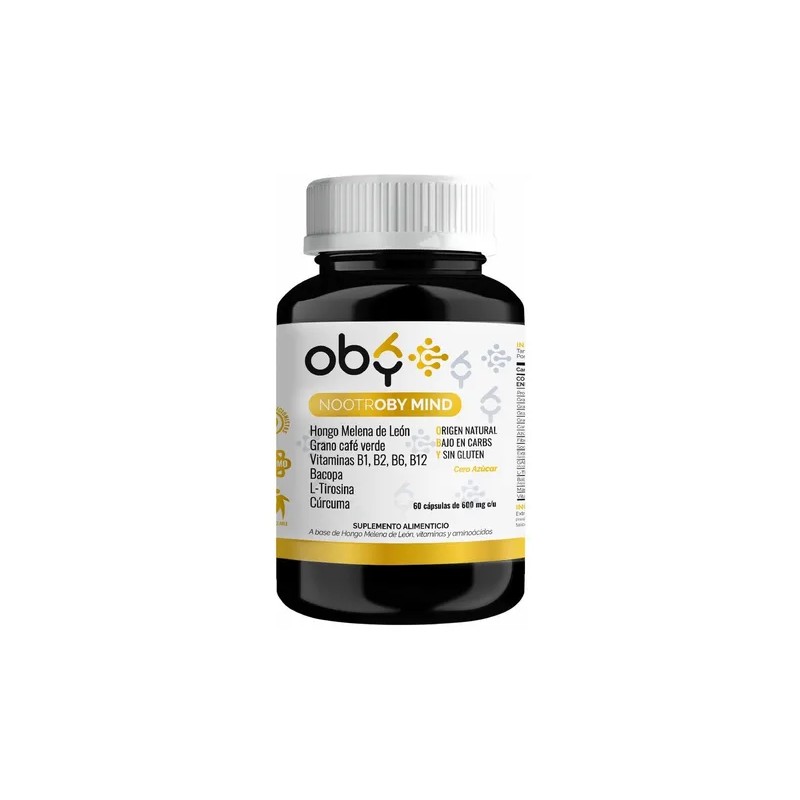 EXPERTOS: NOOTROBY MIND es un suplemento alimenticio con una combinación única de 9 ingredientes 100% Naturales: Hongo Melena de León (Nootrópico natural), Bacopa Monnieri, L-Tirosina, Grano Café Verde, Vitaminas B12, B1, B2, B6 (Complejo B) y Cúrcuma.