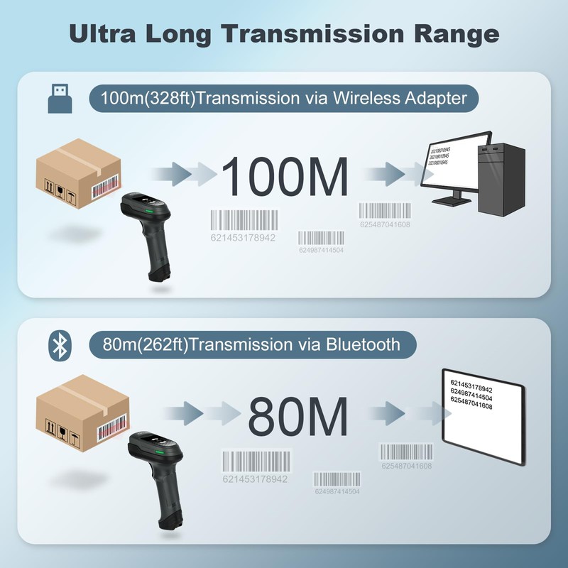 - 💡【Prolonged Battery Life and Connection Distance】2200mAh Large battery capacity, allows 10 hours continuous scanning and 100 days standby, twice the stand-by time of others. Wireless transmission distance reaches 100m/328ft in barrier free environment. This bar code scanner with vibration capabilities to help in noisy environments. Vibration support on and off.