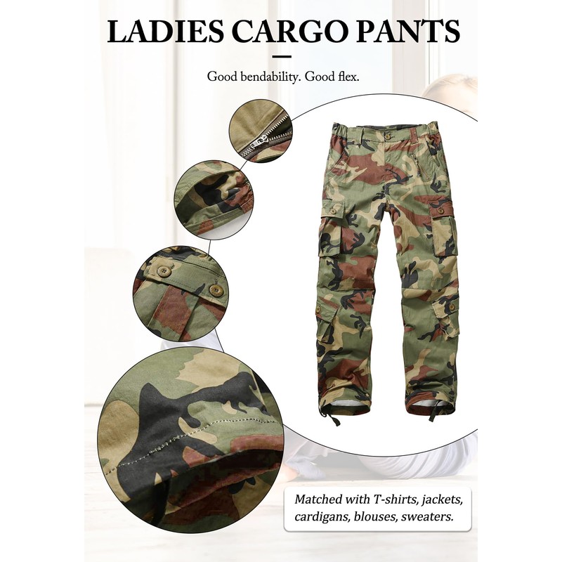 - Army Pants for Women with Multi Pockets: Pants for women are equipped with 9 pockets for safe storage, including 2 front hand pockets; 2 buttoned cargo pockets; 2 side calf pockets with button; 2 buttoned rear pockets and 1 left front zipper pocket for storing cards. Offers you enough big capacity for Your cell phones, keys, wallets and other items or tools