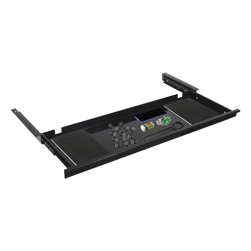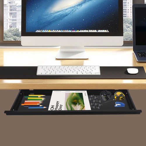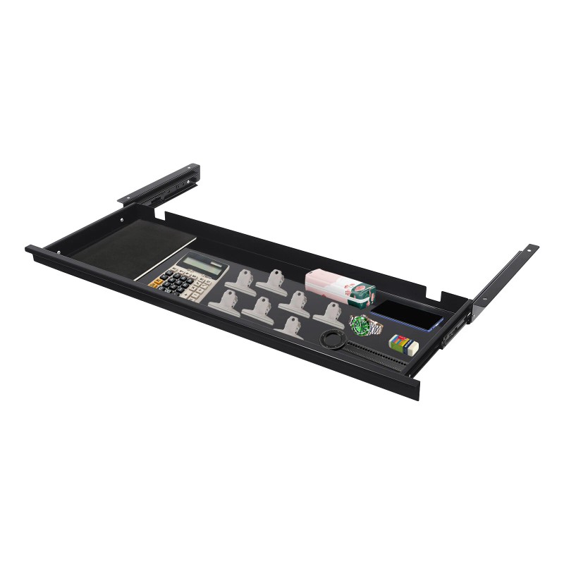 It is installed under the table to store various items, such as a keyboard, mouse, books, iPad, phone, pen, pencil, glue, eraser, adapter, earphone, cosmetics, or other small items used regularly. It is designed to fit both standing desks and standard fixed-height workstations.