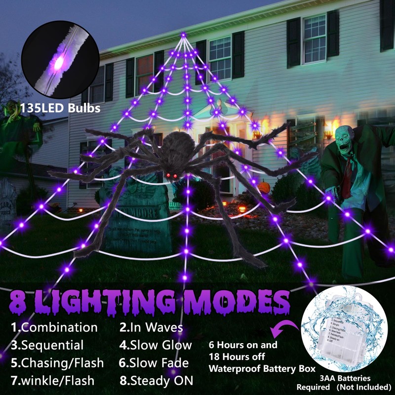 - 8 LIGHTING MODES: Halloween spider web outdoor is dotted with 135 purple LED lights that illuminate the Halloween party decorations. LED lights are low voltage, energy saving and safe for kids and pets. 8 different lighting modes (Combination, Waves, Sequential, Slow Glow, Chasing/Flash, Slow Fade, Winkle/Flash, Steady). Switch modes at will using the battery case. The 16.4 FT traction cable allows you to control Halloween lights outdoor from the ground. Make your Halloween more fun this year!