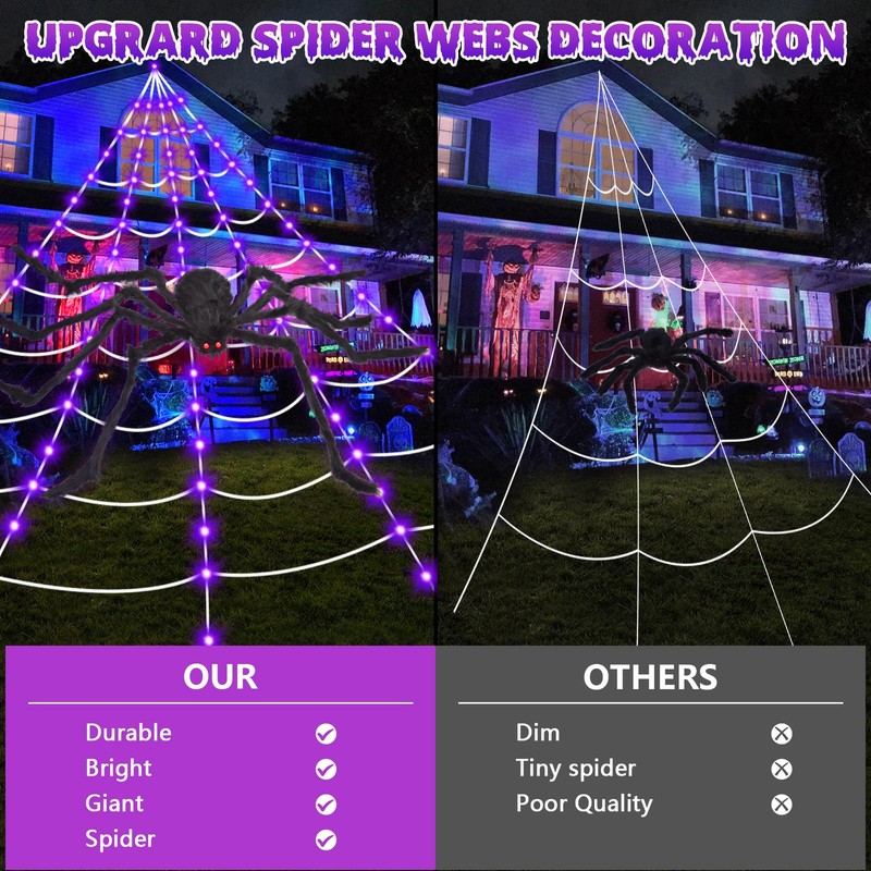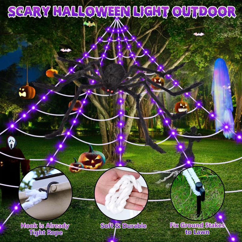 - VIVID & SCARY DESIGN: Big Halloween spider with scary red eyes, it's creepy. One giant spider lies on the Halloween spider web, filled with the atmosphere of terror. The large spider Halloween decorations adds super bright purple light beads. A clever combination of purple lights and spider webs, this spider webs Halloween decorations will be your Halloween bombshell at night! Place spider decorations in your yard or home to get the attention of children and adults