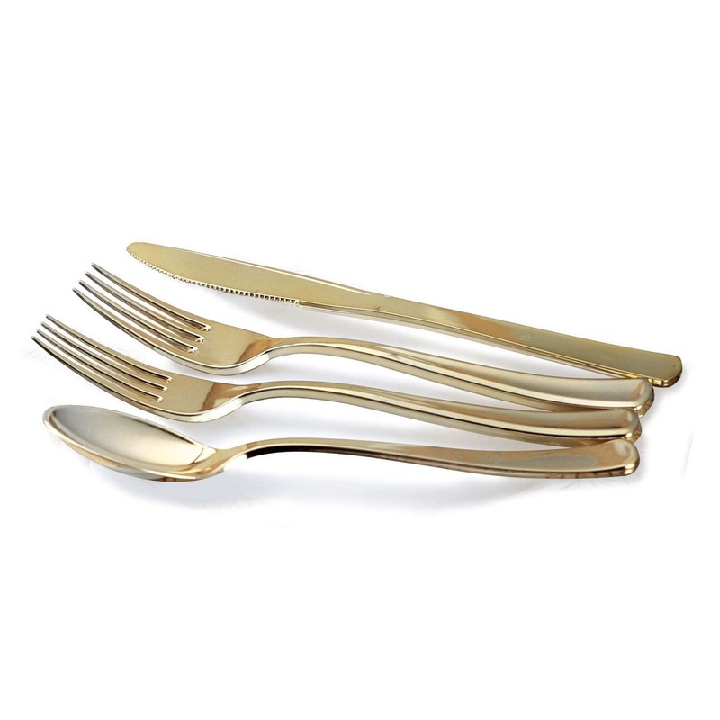 - Combo "C" for 40 guests Includes 360 pcs : 40 x 10.5'' Plate , 40 x 7.5'' Plates (White with gold rim), 40 x 10 oz gold rimmed clear tumblers , 40 knives, 40 spoons and 80 forks (gold coated) + 40 pcs 16x16, White Linen Like Paper Dinner napkins( 1/4 fold) + 40 pcs gold Imitation Rhinestone Napkin rings
