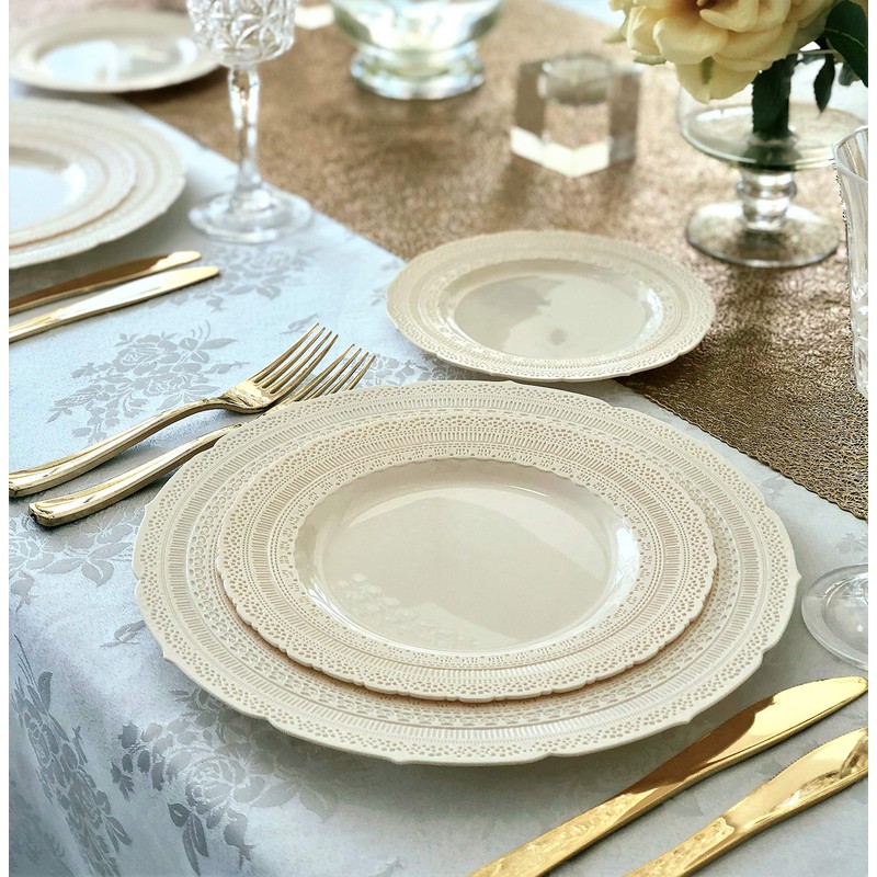 " OCCASIONS" 360 Pcs set (60 guest) - Extra Heavyweight Vintage Wedding Party Disposable Plastic Plates + Silverware (Double Fork) (Chateau in Ivory, Gold Silverware)