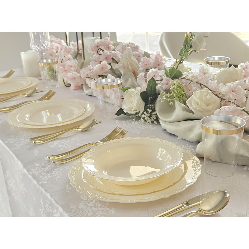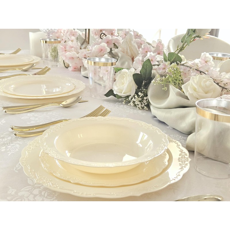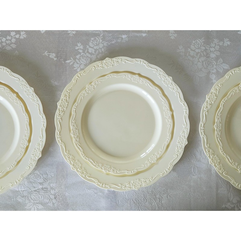 - Looks like real china. Ideal for holidays, large gatherings, weddings and special events, where you want an elegant and fancy look with the convenience of disposable. Made out of high gloss premium disposable plastic.