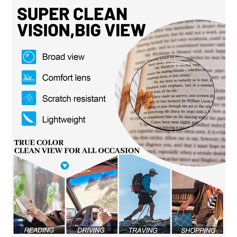 AC High-Definition Lens: Strengthen AC lens with good quality transmittance makes the vision clear, and scratch resistant lens. Uncolored lens, bring you good visual experience