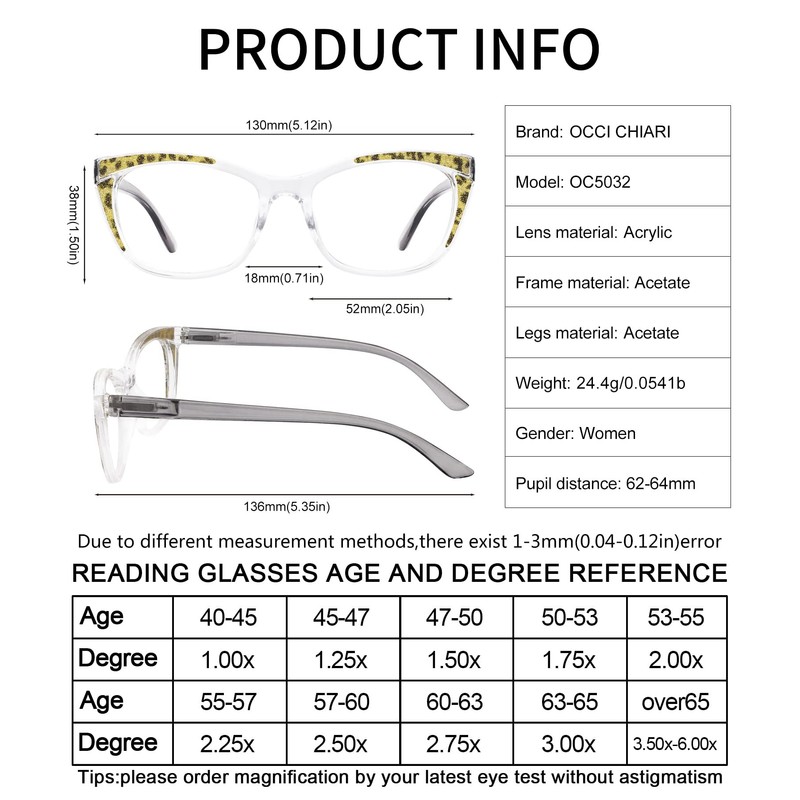 - CLEAR LENS/GOOD MAGNIFICATION :OCCI CHIARI lense is made of the acrylic lenses,is clear enough.This reading glasses have A-class clear lenses which have higher precision as well ,Use them daily for small print reading,makes the vision clear,improved your vision,give you a very big and sharp view,there are 1.0x, 1.5x, 2.0x, 2.50x 3.0x 3.5x 4.0x 5.0x 6.0x strength for selection
