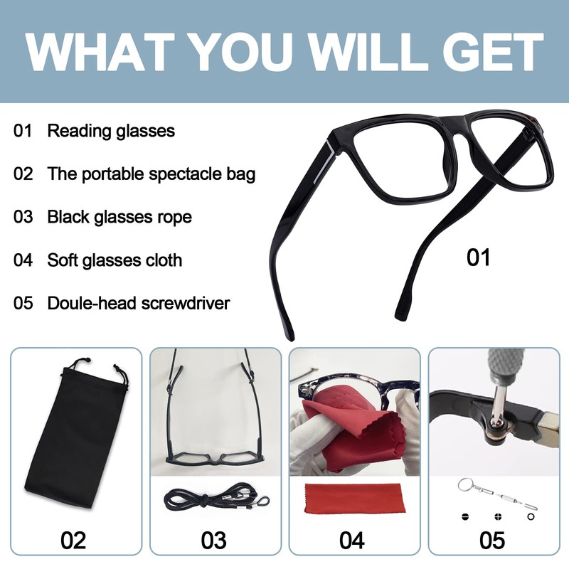 - Package as gift:1 reading glasses.2 the portable spectacle bag and soft glasses cloth(to help protect your glasses from dirt, fingerprints and from breaking),3.black glasses rope 4 doule-head screwdriver,you tighten glasses frame
