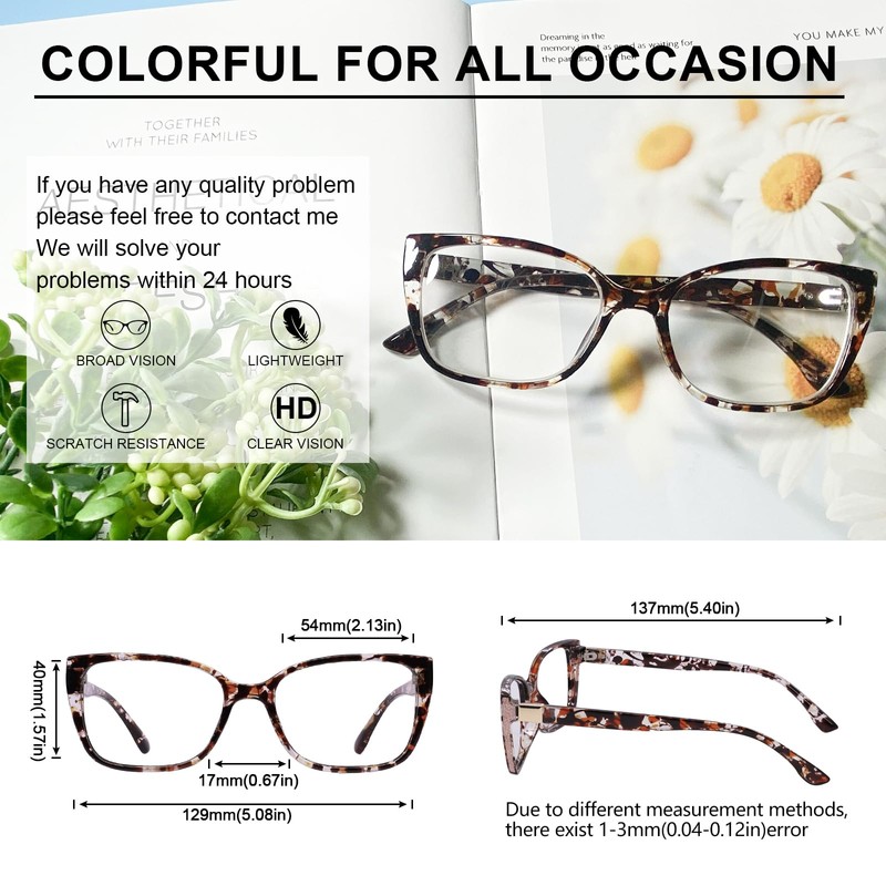 - Reading glasses 1.0 size: Frame width-129mm,Lens width-54MM, Lens height-40MM, Bridge-17MM, Arm length-137MM, Fit for Women.
