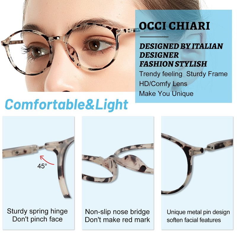 - Clear lens/scratch :OCCI CHIARI reading glasses has optical,strong,durable frame and acrylic ,This women’s round reading glasses use A-class lenses which have higher precision as well ,scratch-resistant coating technology improves visual clarity and keeps lenses clear optimal viewing. this reader glasses have 1.0x 1.25x 1.5x 1.75x 2.0x 2.25x 2.5x 2.75x 3.0x 4.0x 5.0x 6.0x strength for selection