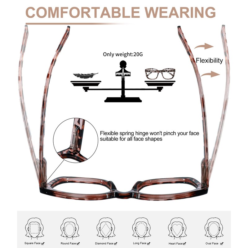 The stylish computer readers with flexible spring hinge won’t pinch your face; sturdy metal spring is more durable and not easily damaged. Full ergonomic design with blue light protection give you a all-day comfy wearing.