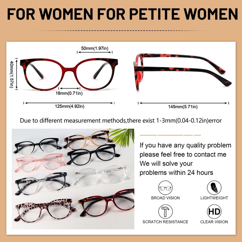- Classic&Comfort: featuring a translucent plastic face front Timeless round frames are elevated to a stratospheric level of style in pretty floral pattern, pull off a look so classic and yet so fresh with plenty of room to conceal thick lenses,The lightweight (23g)construction adds all-day comfort that will instantly make these frames a top fave;metal spring hinge have a slight stretch to accommodate various head sizes;nose bridge is snug,and don't slip