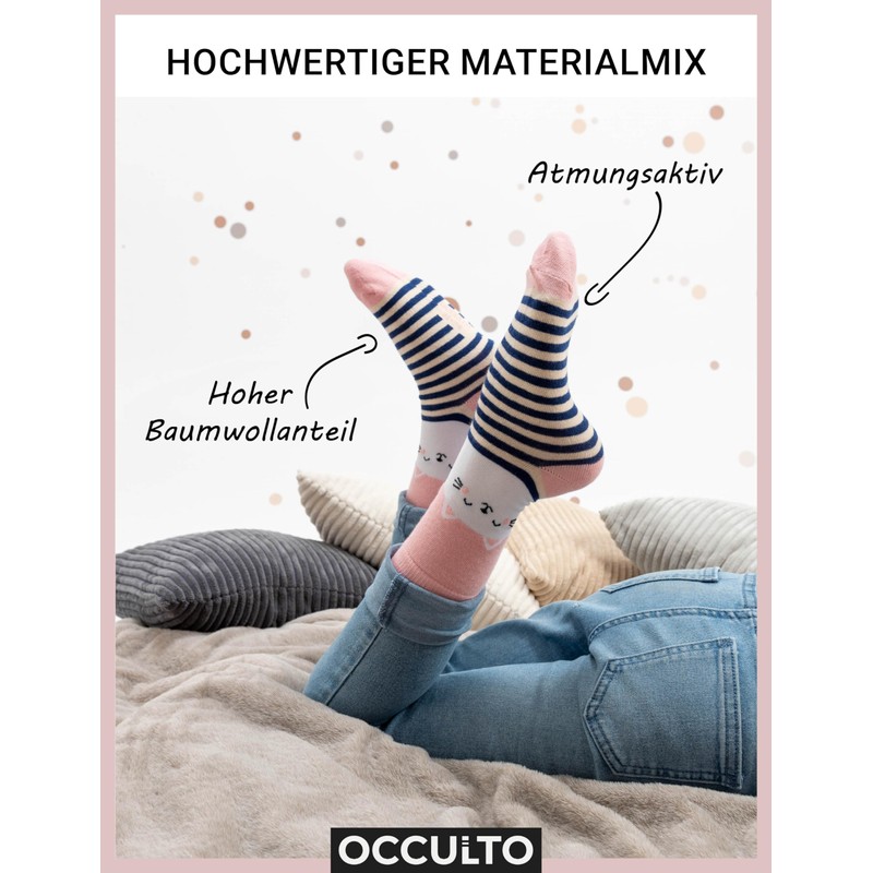 - Material properties: Our colourful children's socks are made from a classic cotton/polyamide blend. The best properties of the two fabrics, such as the comfort and moisture behaviour of cotton combine with the breathability and durability of polyamide. Elastane makes the material extra stretchy and ensures a comfortable fit without pressure points