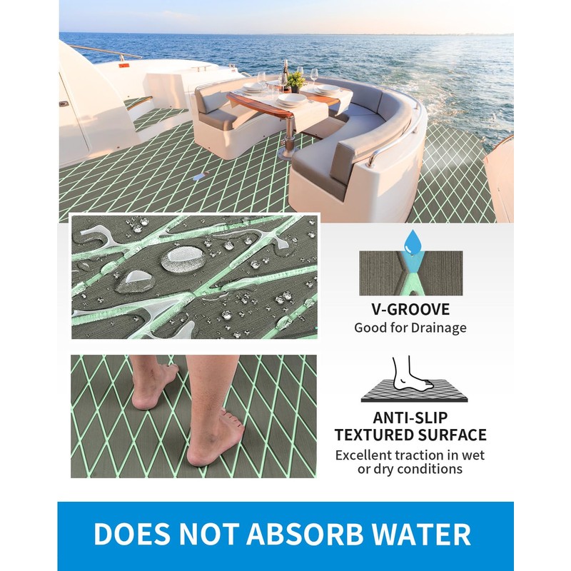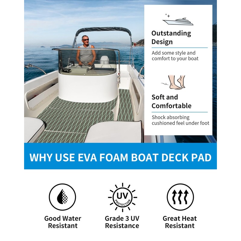 - 6 mm High Quality Closed Cell Eva Foam: Premium soft boat decking material provides great heat resistance, water resistance and level 3 UV stability for durability in harsh climates; eva foam gives you a shock-absorbing cushioned feel under foot. Protects boat surface from scratches, reduces noise; it is recommended for installation on metal or fiberglass decks or other flat, smooth surfaces