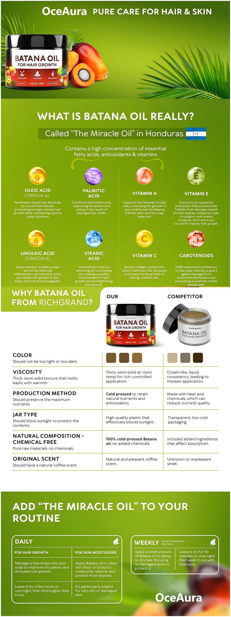 - 100% Organic Ingredients Rich in Vitamins: Properly prepared batana oil contains many nutrients, oleic acid (omega-9), linoleic acid (omega-6), palmitic & stearic acid, along with vitamins A, C, E for hair care