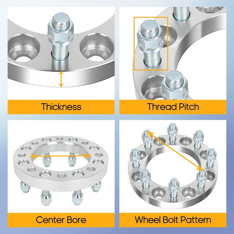 • Wheel Spacers Bolt Pattern Specifications-Thickness:2.54 mm or 1 inches ;Centerbore:126mm mm ; Hubcentric:no ;Vehicle Bolt Pattern:8x165.1 mm ; Wheel Bolt Pattern:8x165.1 mm or 8x6.5 ; Thread:9/16"