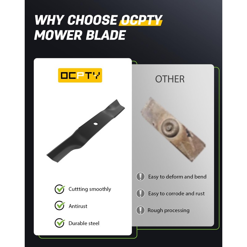 - BLADE ADVANTAGES:OCPTY offers a variety of lawn mower blades to meet your unique cutting needs. Sharp blades can cut grass cleanly, pass through the grass more effectively, and reduce overall mowing time and energy