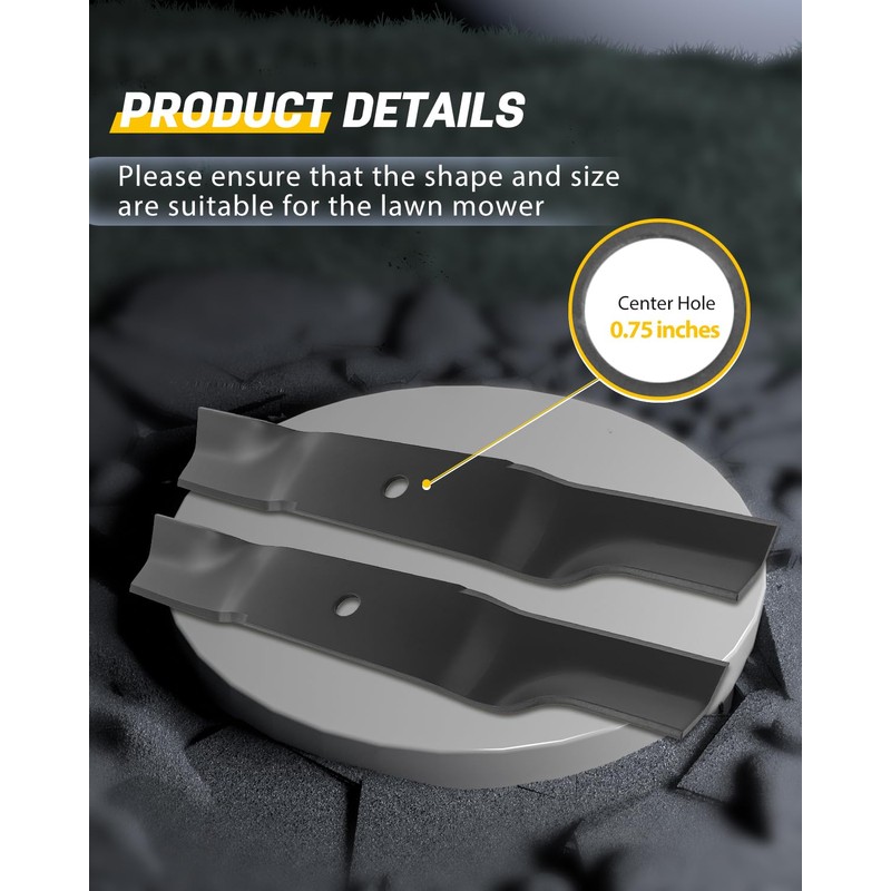 - BLADES DETAILS: Set of 3 lawnmower blades included; Blade length: 19 inches, Width: 3 inches, Thickness: 0.197 inches, 0.75 inches Center Hole, Cutting Deck Size: 54 inches, blade material: iron