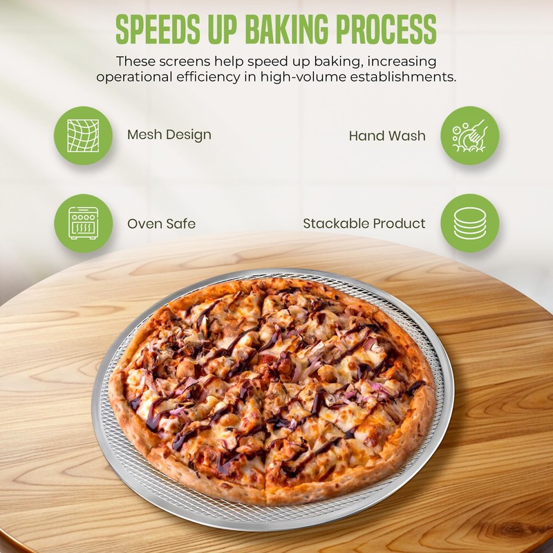 - Lightweight and Durable Aluminum Construction: Made from high-quality aluminum, these pizza screens are lightweight yet durable, designed to withstand frequent use in commercial kitchens. They provide excellent heat conduction for perfect pizza crusts.