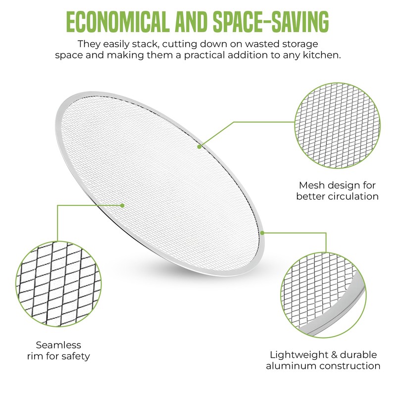 - Economical and Space-Saving: Cost-efficient and designed for high-volume use, these pizza screens are perfect for pizzerias, sandwich shops, and restaurants. They easily stack, cutting down on wasted storage space and making them a practical addition to any kitchen.