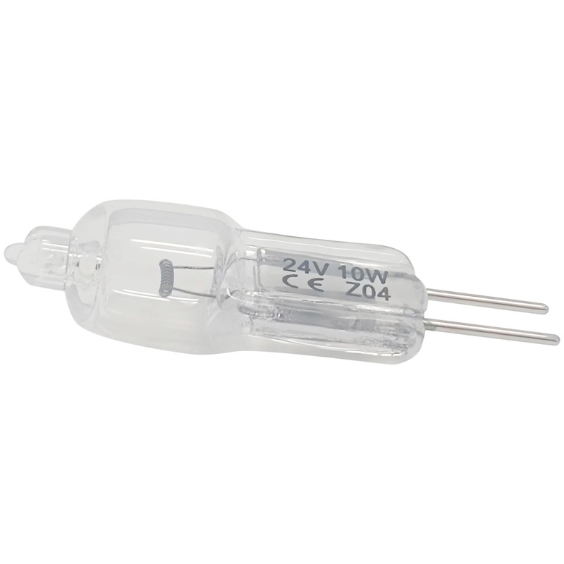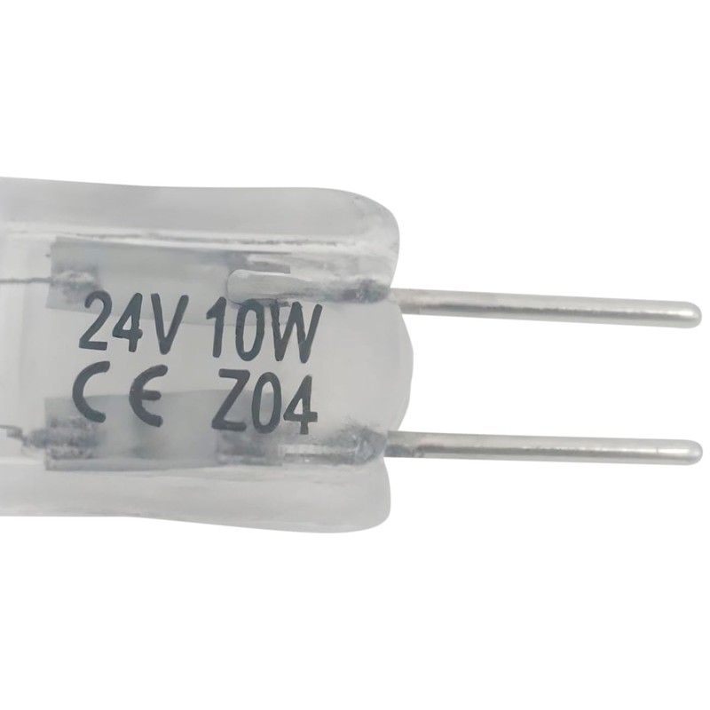 - Specifications: These halogen bulbs feature 10 watts, 24 volts, T4 bulb shape, 4 mm pin spacing, 2800k, 30 mm x 9 mm, and a G4 bi-pin base.
