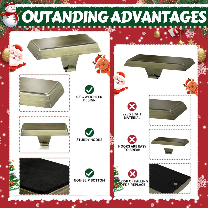 - 【Non-slip Design】The Christmas stocking hanger is equipped with non-slip pads, which can be firmly fixed on the surface of the mantel and will not damage the fireplace, designed to hold both empty and full stockings, exquisite workmanship.