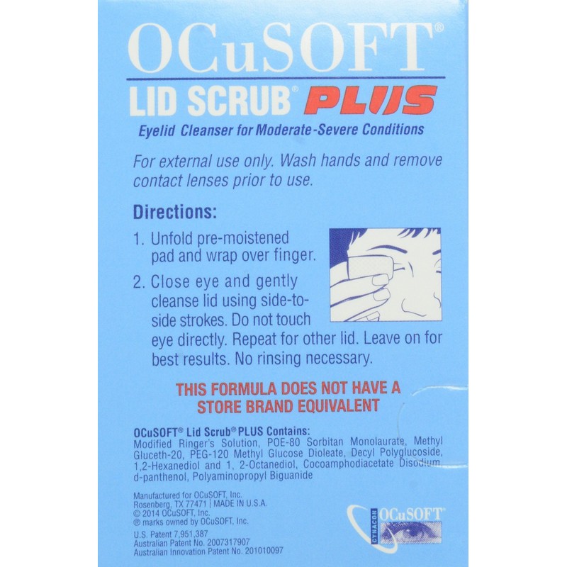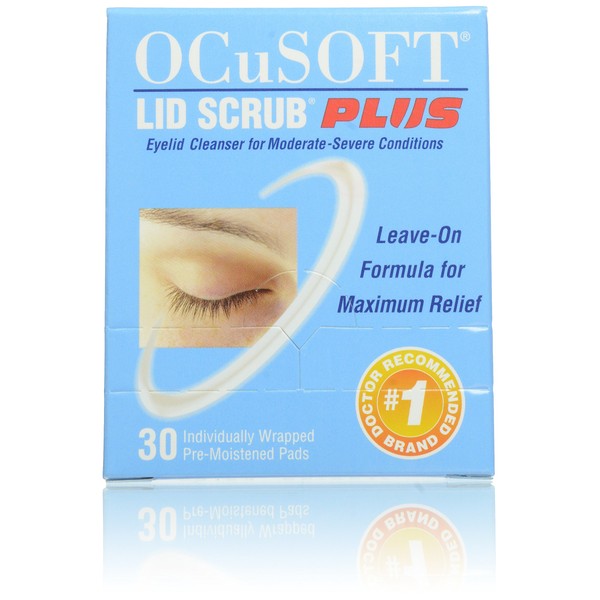 Lid scrub plus formula. Soothes. Relieves irritation. Removes contaminants. Dry, scratchy, irritated eyes? The problem may not be your eyes but rather your eyelids. OCuSOFT Lid Scrub Formulas effectively remove excessive oil, debris, and contaminants that can build up on your eyelids and cause irritation. Lid hygiene can be important to overall ocular health and is often recommended to individuals with dry eyes, blepharitis sufferers, or those preparing for surgery. Feel better, look better. Start using OCuSOFT lid scrub today! Number 1 doctor recommended eyelid cleanser. Scrub plus extra strength formula combines a low-level, proprietary preservative blend that effectively relieves irritation by removing oil, debris and other contaminants. This clinically proven, laboratory tested formula is safe and effective for lid hygiene. Rinse (or leave-on if directed). Proven mild formula; Cleans, moisturizes and refreshes. Convenient, easy-to-use pre-moistened pads.