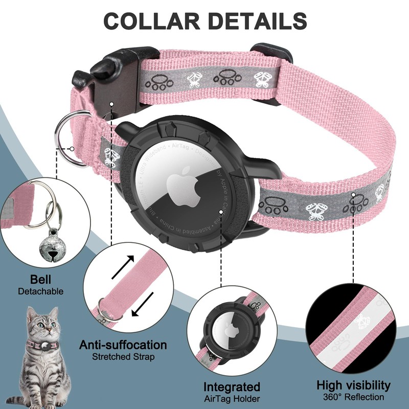 - [ELASTIC & REFLECTIVE] Cat AirTag collar adds elastic strap, make sure that your cat can quickly break free when a foreign object is caught in the neck. In addition, AirTag collar has two reflective strips, you can easily find your cat at night.