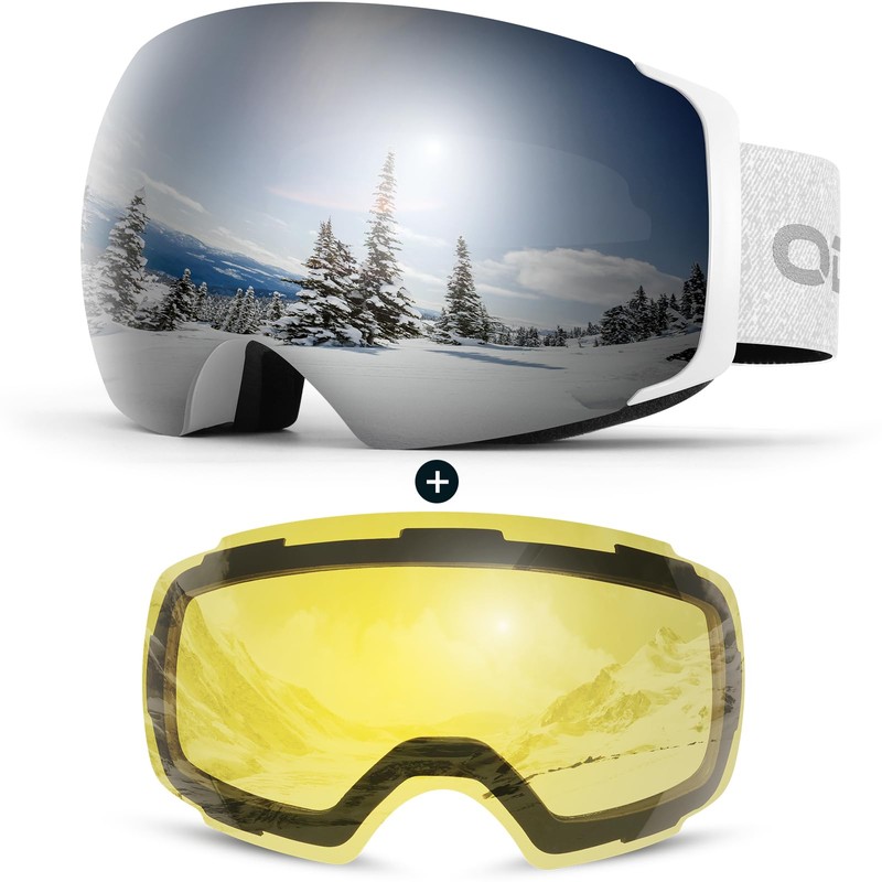 Odoland Magnetic Interchangeable Ski Goggles with 2 Lens, Large Spherical Frameless Snow Snowboard Goggles for Men Women, White Frame Sliver Lens vlt 15%
