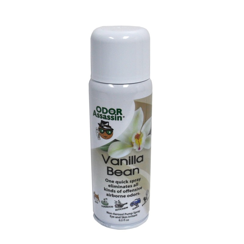 Odor Assassin Odor Eliminator Vanilla Bean Scent. Odor Assassin Odor Eliminator. Eliminates Odors Such As: Tobacco Smoke, Pet Odors, Cooking Oils, Sick Rooms, Bathroom Odors, Trash Containers, Basements, Laundry Areas. 1,500 Sprays In Each 8oz Can. 100 Percent Active Odor Eliminator. Even Beats Skunk Odor. Vanilla Bean Scent. SC-32-0138-07 RO-115042