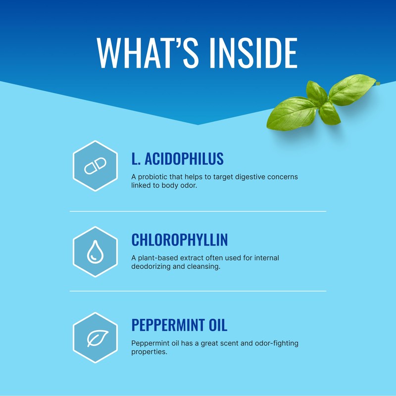 Lactobacillus Acidophilus, Chlorophyllin-Copper Complex, Green Tea (Camellia sinensis Extract), Magnolia (Magnolia officinalis Bark Extract), Peppermint (Mentha piperita Oil) Fennel (Foeniculum vulgare Seed) Other ingredients: Vegetable Cellulose (Capsules)