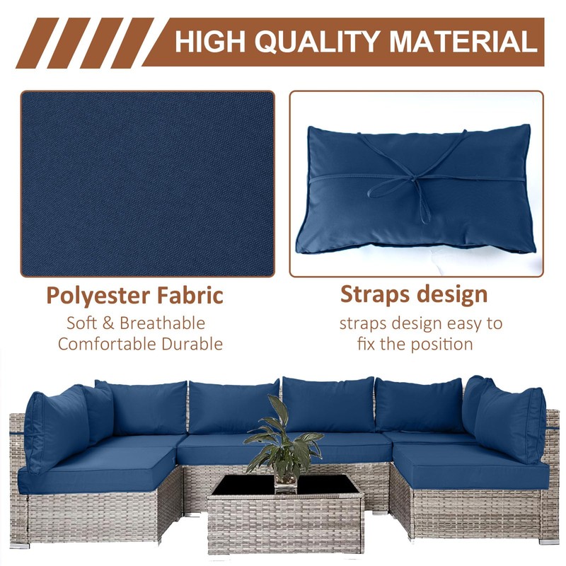 • What You Get: These outdoor patio cushion covers include a total of 14 pieces, 6 piece seat cushion covers (25.6Lx25.6Wx4H inches), 6 piece backrest pillow covers (25.6Lx13.5Wx4H") and 2 piece small back pillow covers ( 21.6Lx13.5Wx4H"). Fits 7 piece Wicker Rattan Sectional Couch Chair Furniture Set