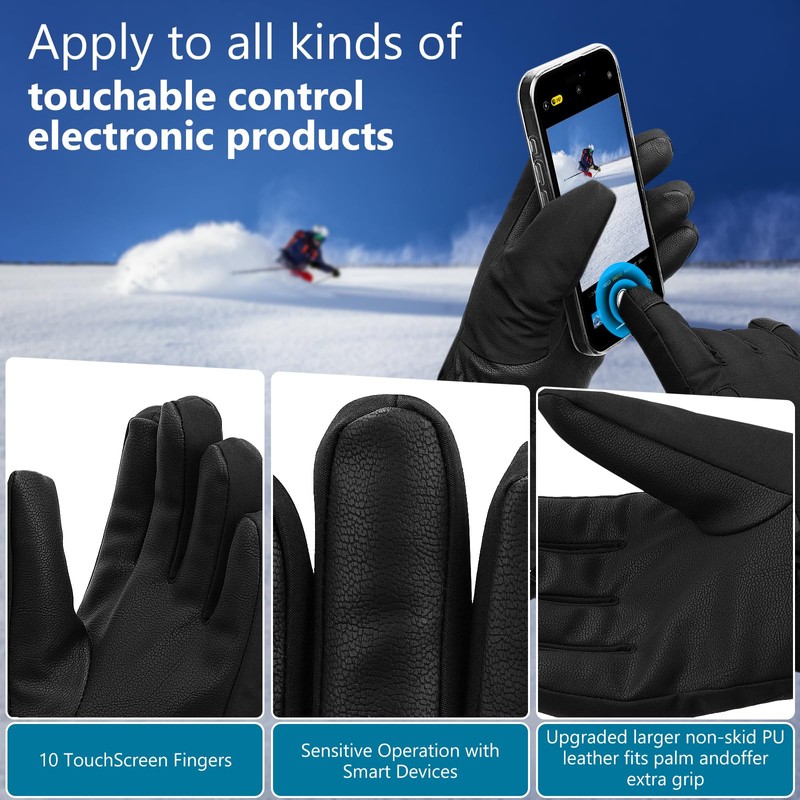 - 【Leather and 5-finger Touch Screen】Warm and waterproof ski gloves are designed with full-finger touch screen, which is convenient for operating electronic products such as mobile phones without taking off gloves when skiing. The non-slip PU in the palm area can increase friction and make it easier for you to grasp snowball fights, snowboards, towing, cable cars and so on.