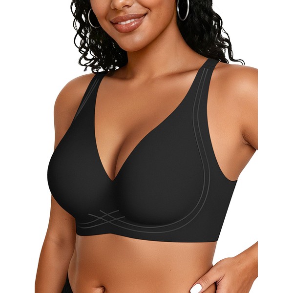 OEAK Womens Comfortable Deep V Bras Wireless Push Up Seamless Full Coverage Bralettes Supportive Bra Raceback Tshirt Bras Black,2XL