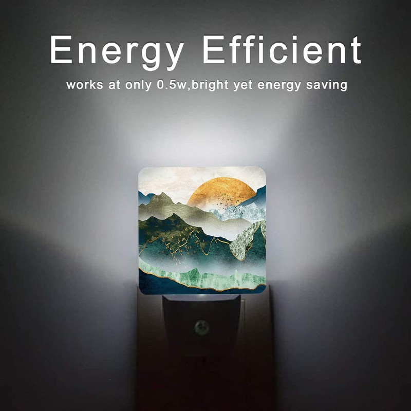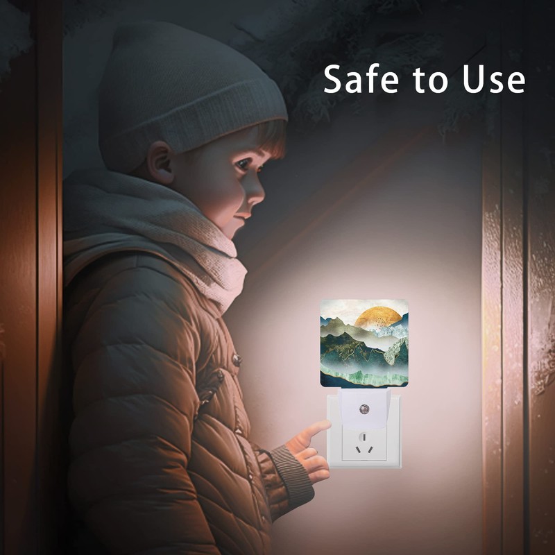 Oeaskly Mountain Night Light,Green Mountains Golden Sunset Plug in Night Lights Auto LED Lamp Energy Saving Square Lights for Boys Girls Men Women