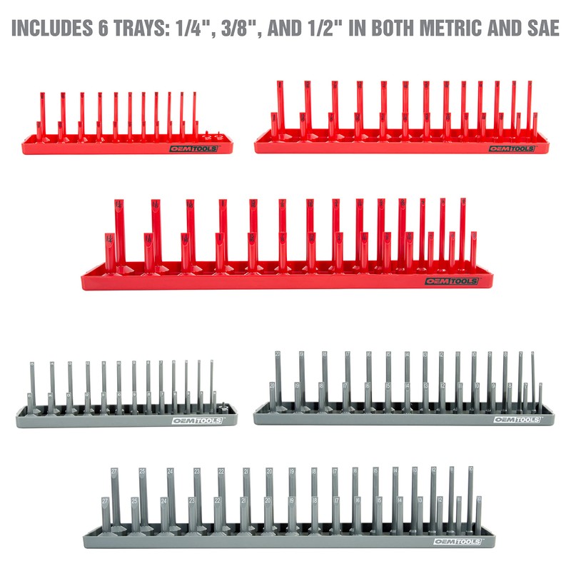 OEMTOOLS 22413 6 Piece SAE and Metric Socket Tray Set, SAE and Metric Socket Storage for Sizes 1/4", 3/8”, and 1/2" Drive, Socket Holders and Socket Organizer Tray for Toolbox, Red/Grey