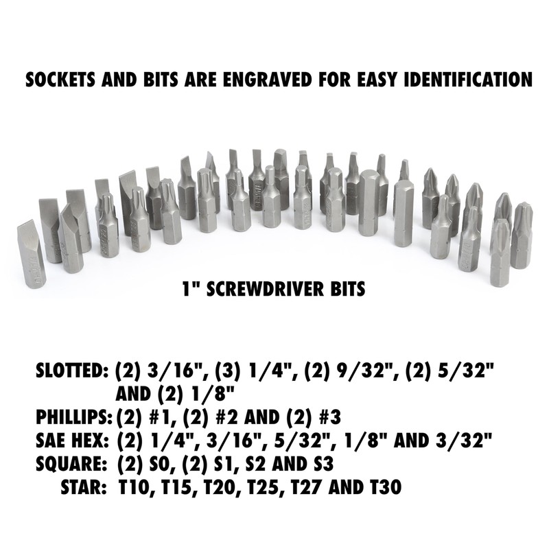 - Clearly Marked Components: All sockets and bits are engraved and arranged by size and type. This helps reduce setup time, keeps your workflow organized, and eliminates the need to search for the right tool during a job.