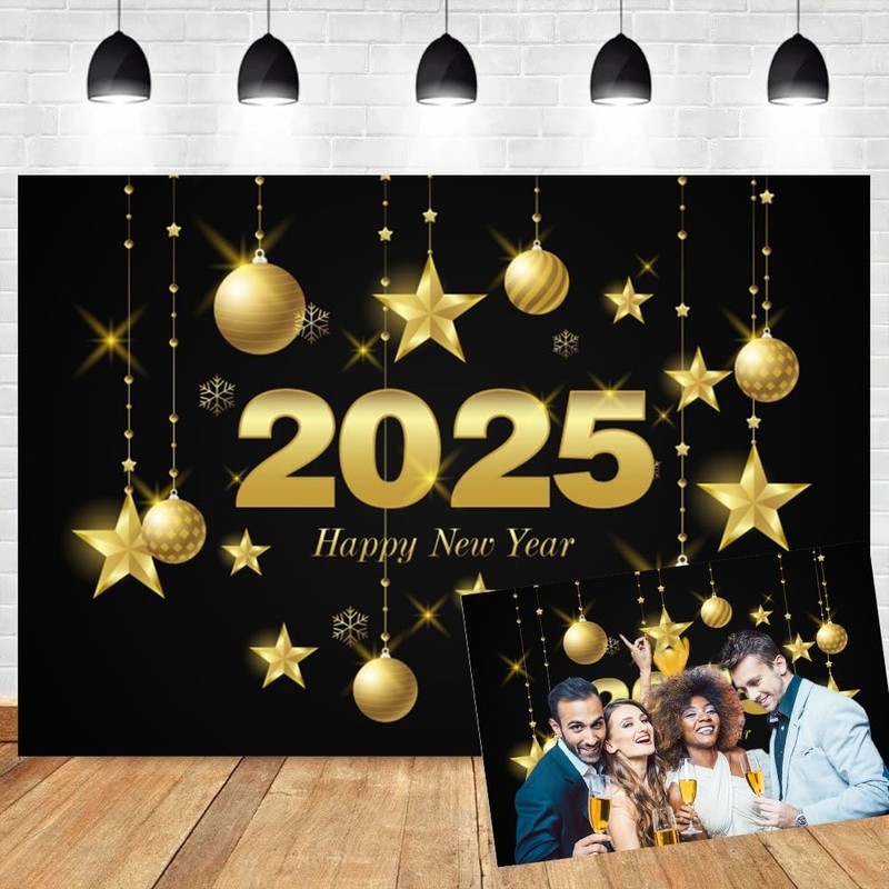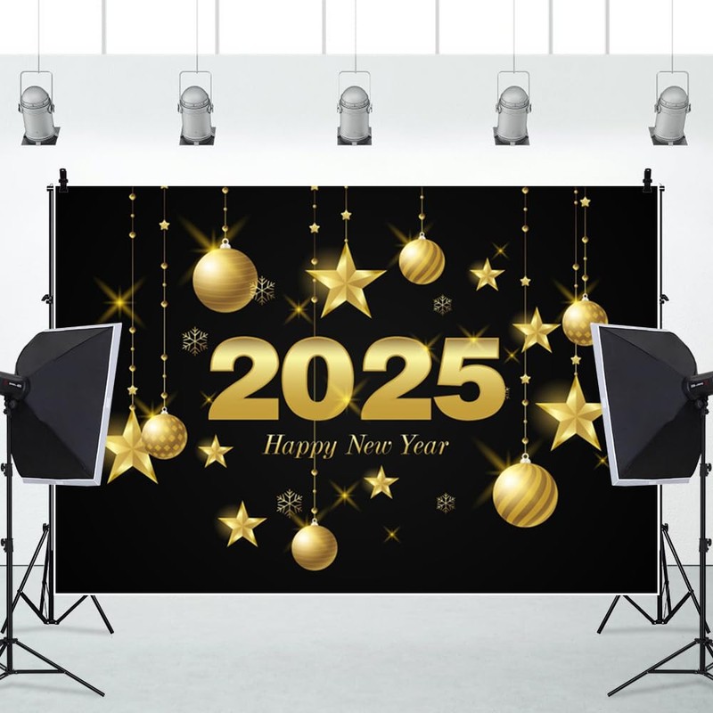 OERJU Happy New Year Backdrop 2025 Black and Gold Snowflake Ball Stars Photography Background Cheers to The New Year Christmas Eve Party Decoration Banner Adult Kids Photo Studio Props 7x5ft