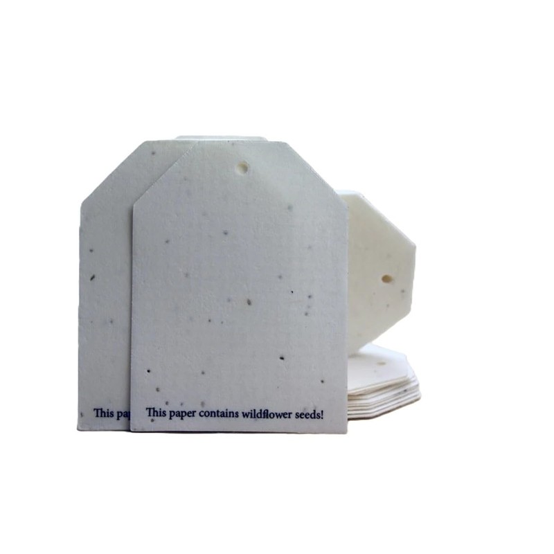 - 1 set of 24 hang tag shapes, made from tree-free cotton fiber embedded with wildflower seeds. Print on back reads: "This paper contains wildflower seeds!"