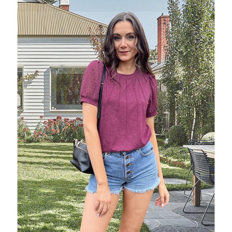 - 【Features】Unique chest pleated design,cute swiss dot puff sleeves,classic round neck t shirt,solid colors and prints available,loose casual,suitable for all body types!