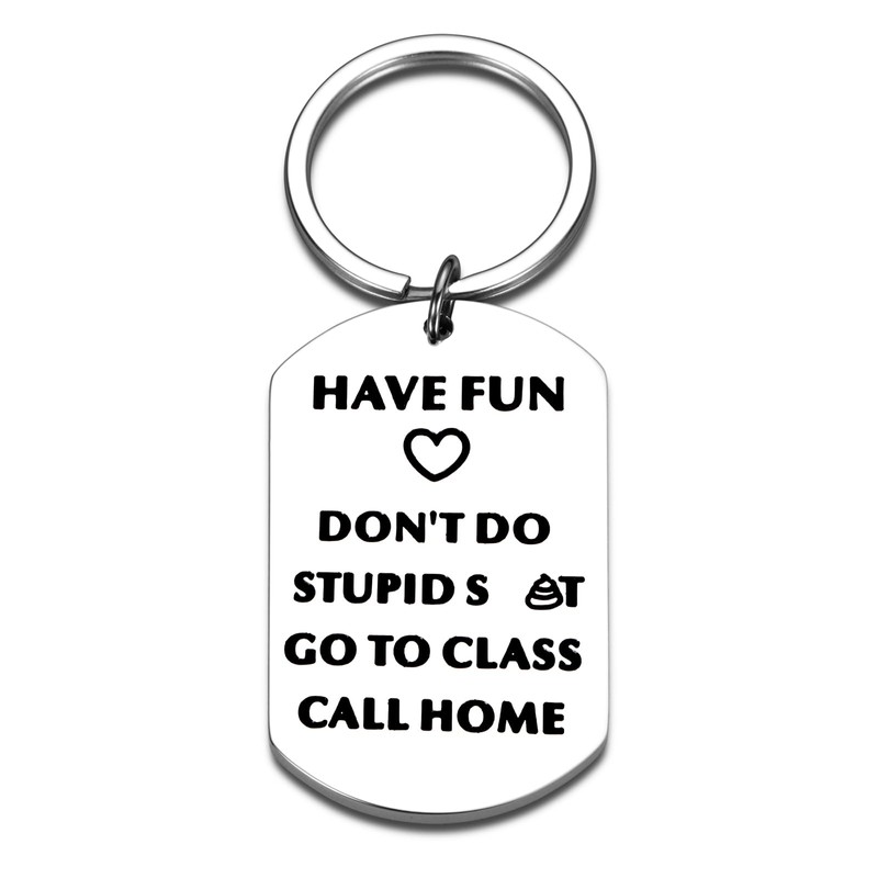 Add a touch of humor and inspiration to your daily routine with our stainless steel keychain. Engraved with the unforgettable words "HAVE FUN DON'T DO STUPID S*** GO TO CLASS CALL HOME", it's more than just a keychain—it's a little piece of wisdom that goes with you everywhere.